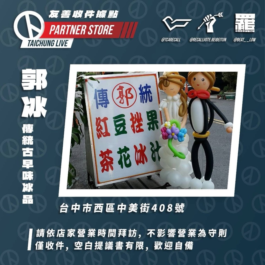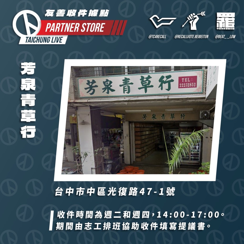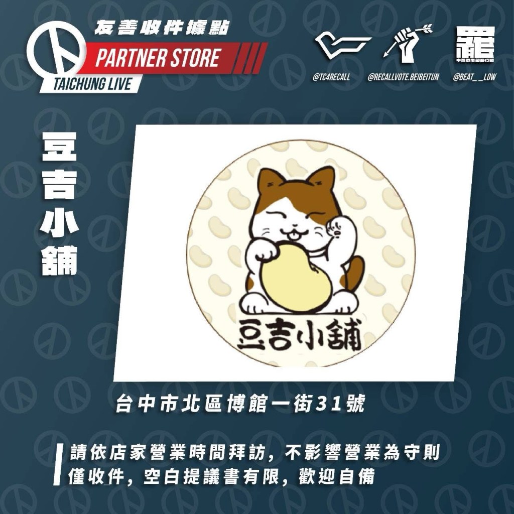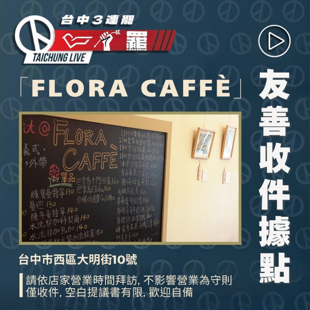 首先非常感謝這些店家願意協助代收連署書,這對台中大罷免是莫大的助力,若有民眾無法在出攤時間前來,可在以下店家的營業時間前往送件,但請注意:
