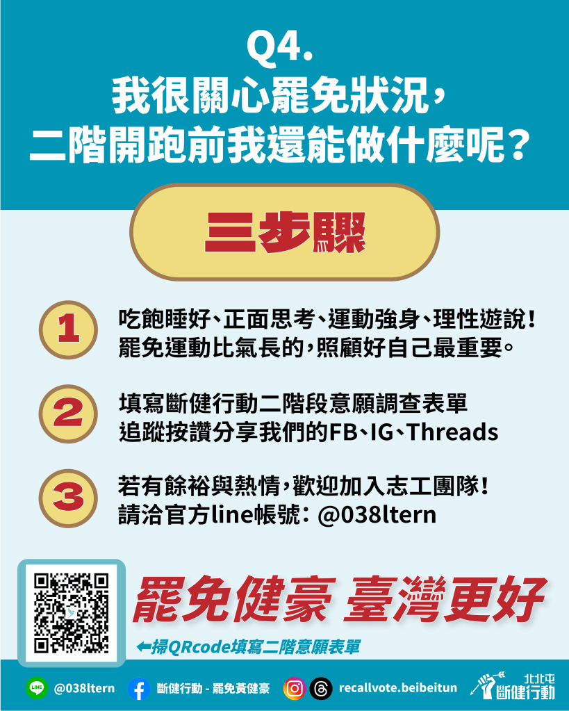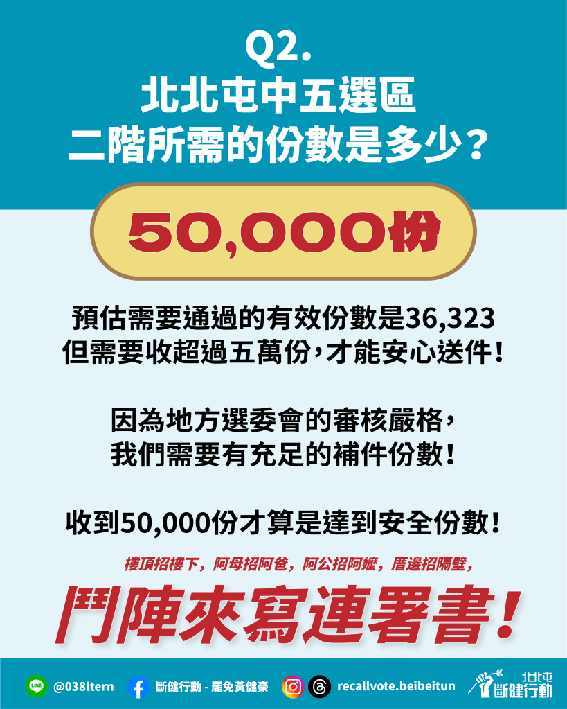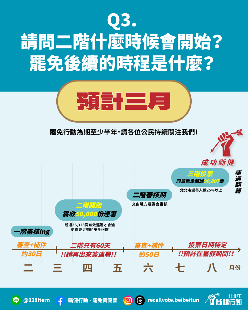 第二階段罷免連署須在60天內送件,扣除掉造冊時間10天,實際只有50天可以衝刺,故3月7日(五)至4月30日(三)是關鍵期。